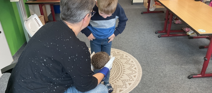Am Freitag vor den Herbstferien bekamen die beiden ersten Klassen Besuch von der Igelhilfe Weißenhorn. Frau Siebinger wiederholte mit den Kindern was Igel fressen, welchen Gefahren sie ausgesetzt sind und wie man ihnen helfen kann. Das Highlight für die Kinder war ein mitgebrachter Igel, der gerade aufgepäppelt und bald wieder in der Natur ausgesetzt wird.